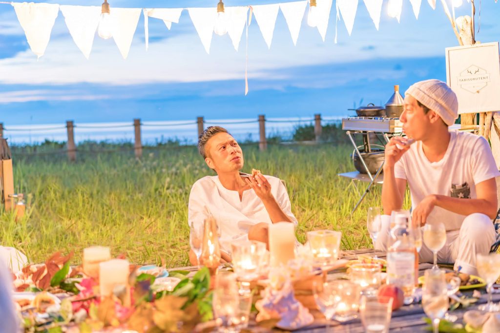 夏に佐渡島でグランピングをしてきました。目の前に広がる海に沈む夕日。日が落ちると満天の星空の中で映画鑑賞。